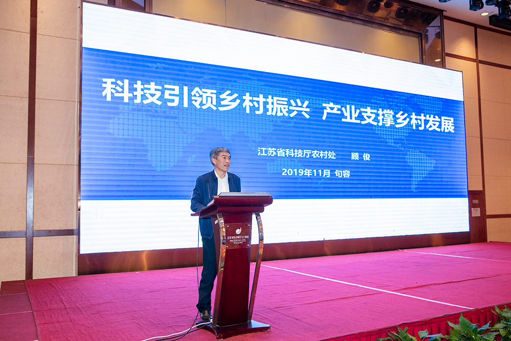 顾俊调研员作“科技引领乡村振兴产业支撑乡村发展”主题报告,他回顾总结了江苏省科技厅涉农重点工作和取得的成效,并从科技引领、产业支撑两个方面分析了实现乡村振兴有效途径,重点介绍“科技创新40条政策”中与农业科技创新有关的政策,最后希望参会企事业单位加强农业农村科技创新和实用技术研发、加快高校农业科技成果转化应用和技术集成示范、助力打好产业扶贫精准脱贫攻坚战,大力培养“一懂两爱”农业农村人才。