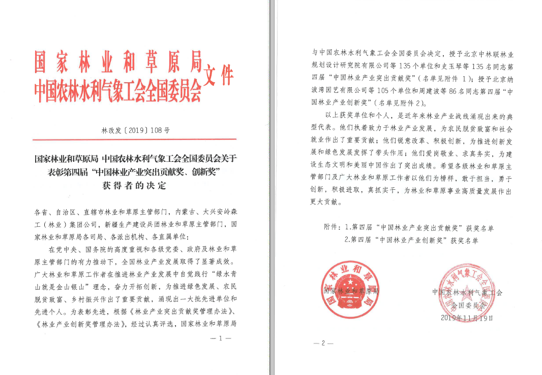 “中国林业产业突出贡献奖、创新奖”是经国务院批准设立的我国林业产业最高荣誉,由国家林业和草原局、中国色花堂水利气象工会全国委员会评选,旨在表彰为推进林业产业绿色发展、农民脱贫致富、乡村振兴中做出重要贡献的先进单位和先进个人。每两年评选一次,此次全国共评出“突出贡献奖”单位135家、个人135名,“创新奖”单位105家、个人86名。