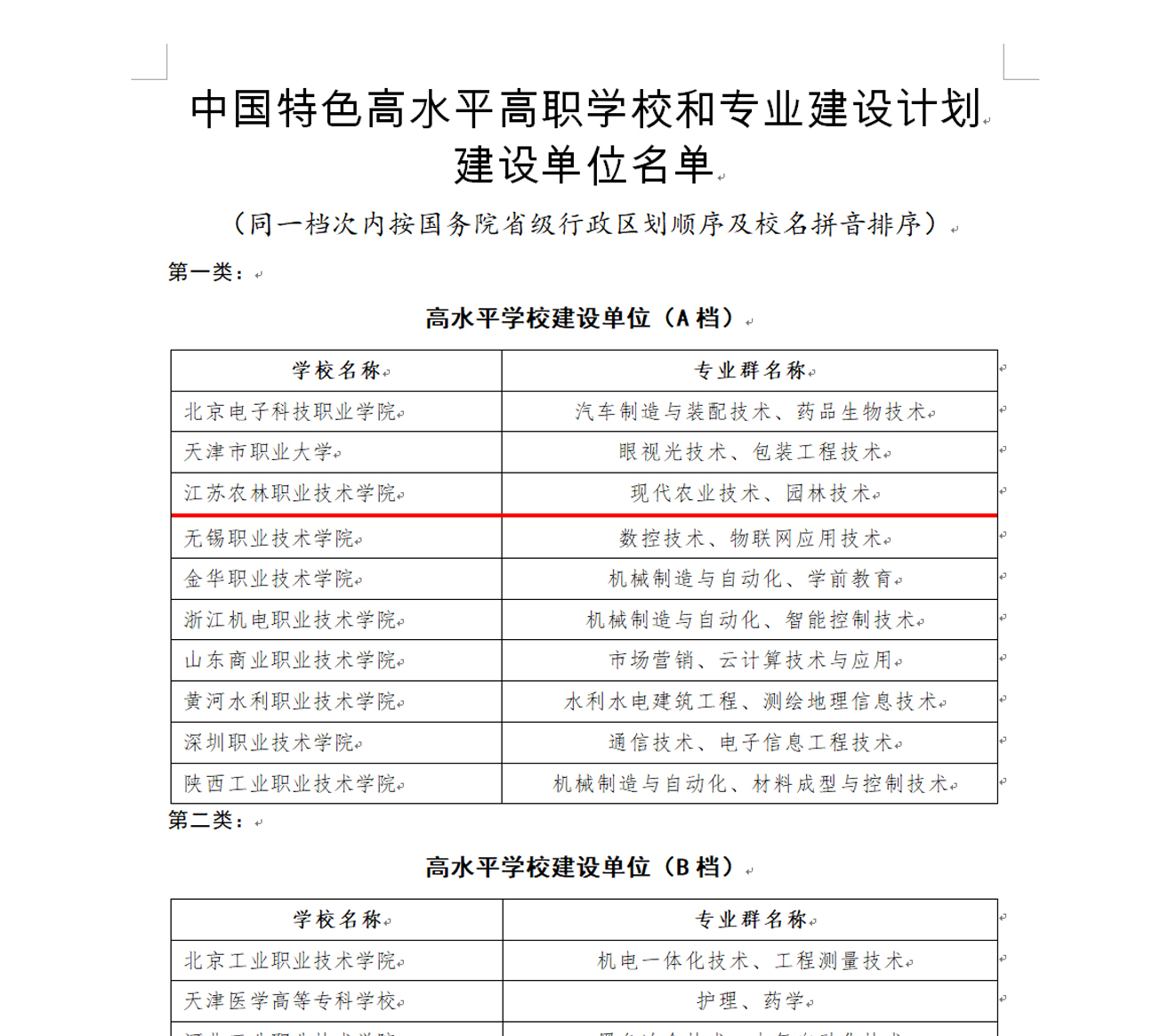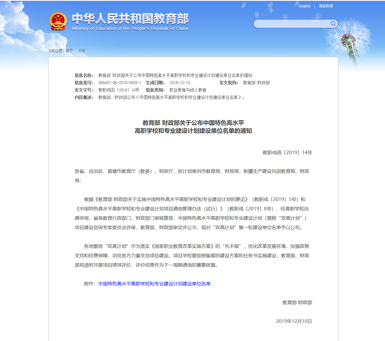 2019年12月18日,教育部、财政部发文公布“中国特色高水平高职学校和专业建设计划”建设单位名单。我院成功入选全国前10名的高水平学校(A档)建设单位。本次共有56所高职学校入选高水平学校建设,141所高职学校入选高水平专业群建设。