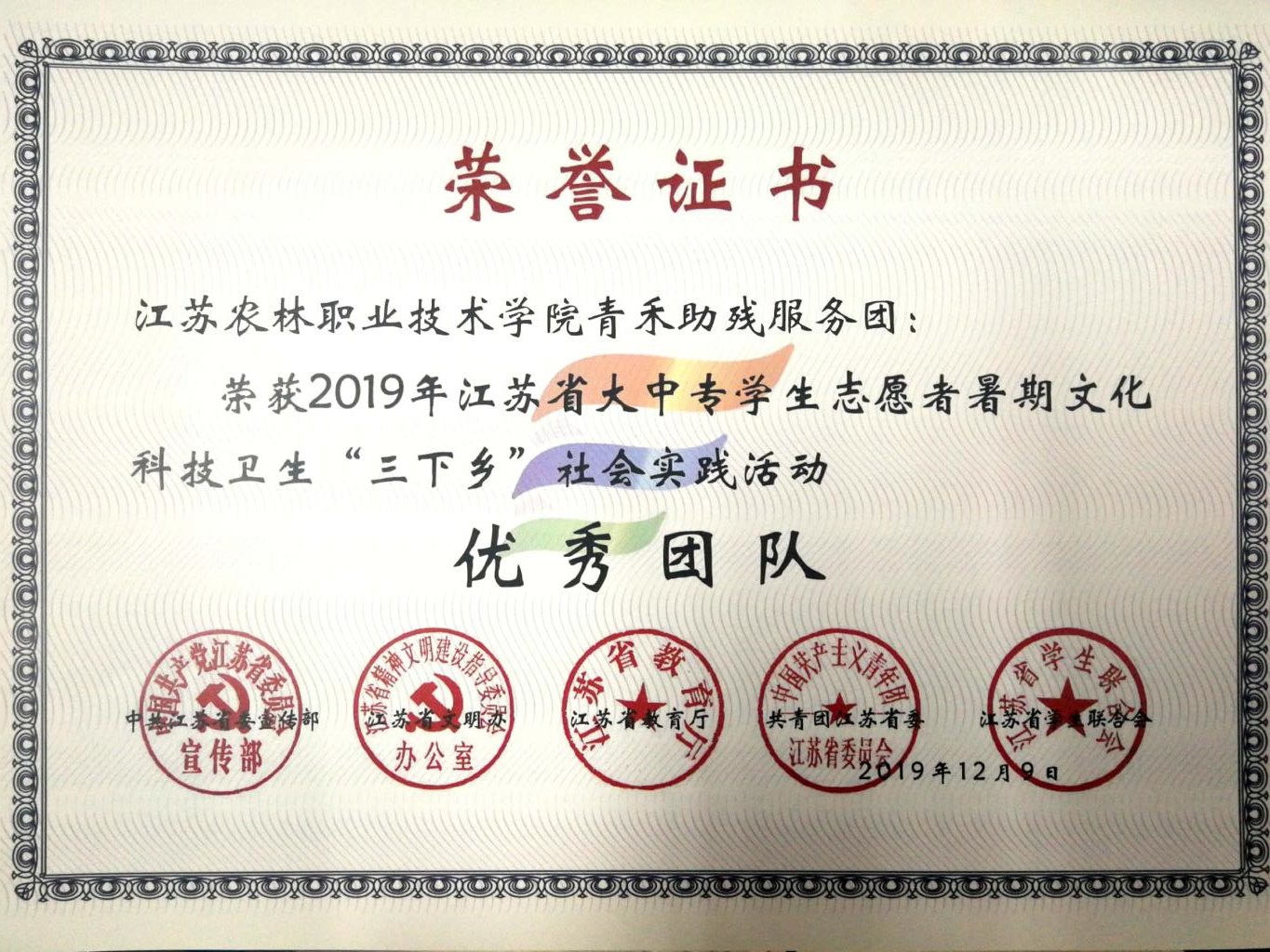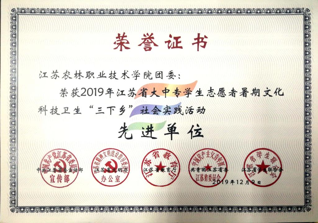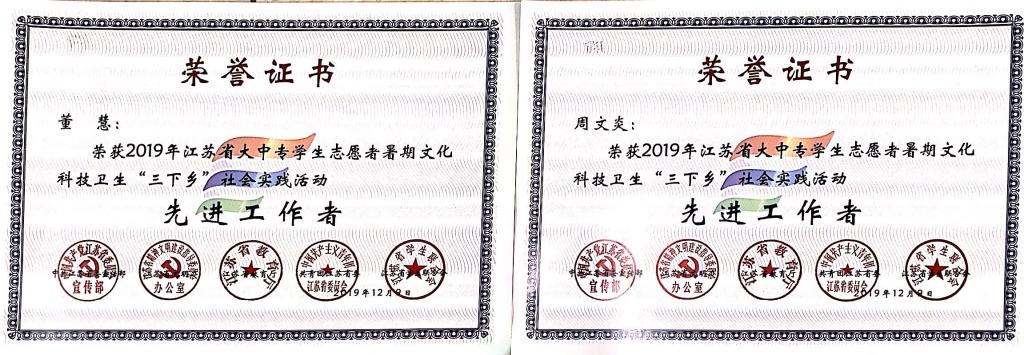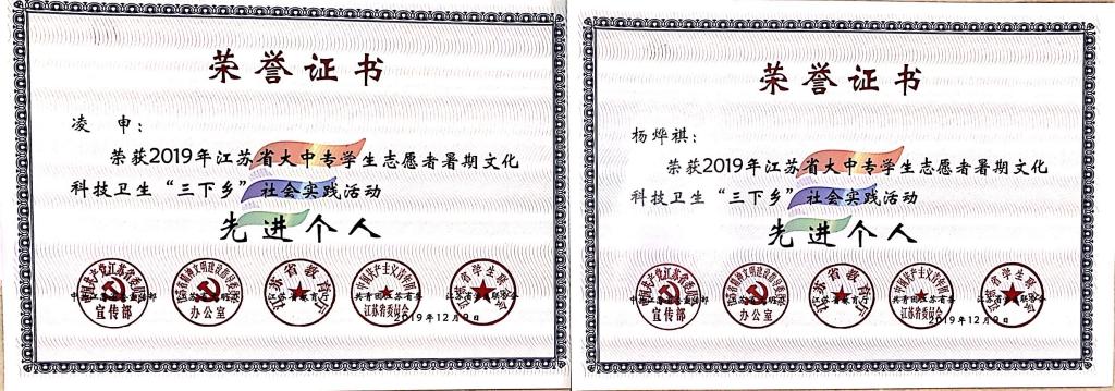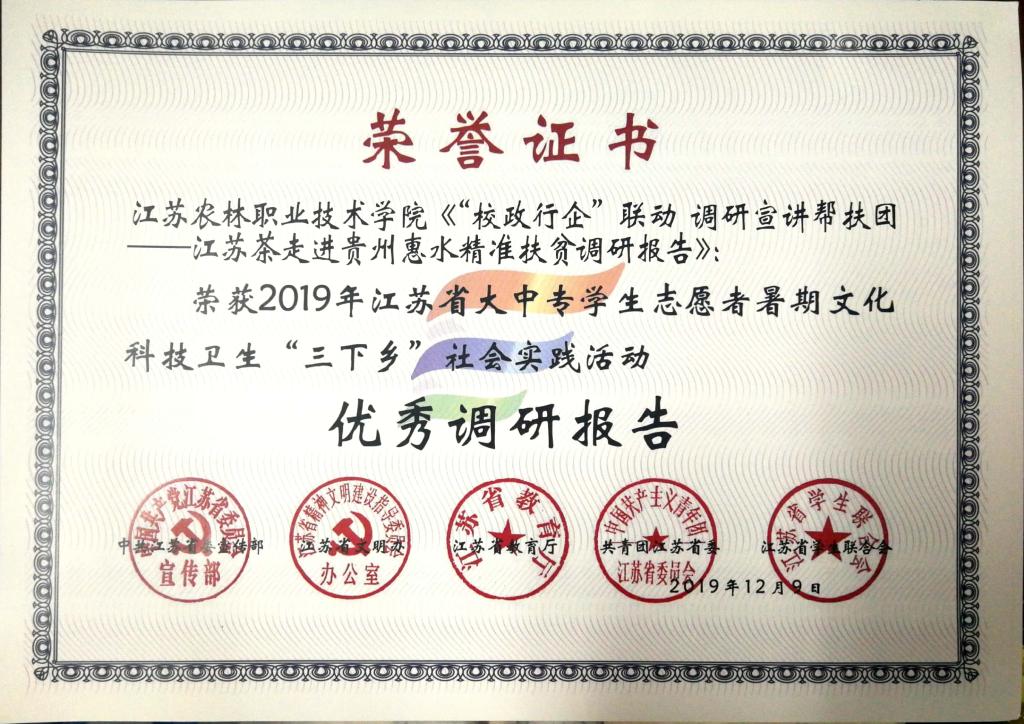 近日,中共江苏省委宣传部、江苏省文明办、江苏省教育厅、共青团江苏省委、江苏省学生联合会联合发文,公布了2019年江苏省大中专学生志愿者暑期文化科技卫生“三下乡”社会实践活动总结通报结果。色花堂 团委荣获2019年全省暑期社会实践先进单位称号,“青禾助残服务团”获优秀团队,茅山校区团委《“校政行企”联动调研宣讲帮扶团——江苏茶走进贵州惠水精准扶贫调研报告》获优秀调研报告,董慧、周文炎两位老师荣获先进工作者,凌申、杨烨琪两名同学荣获先进个人。