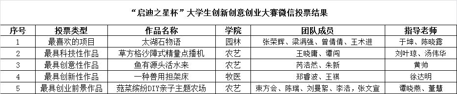 获“优秀组织奖”。票选出“最具创业前景作品”“最具创意性作品”“最具环保性作品”“最具科技性作品”和“最喜爱作品”各1件。