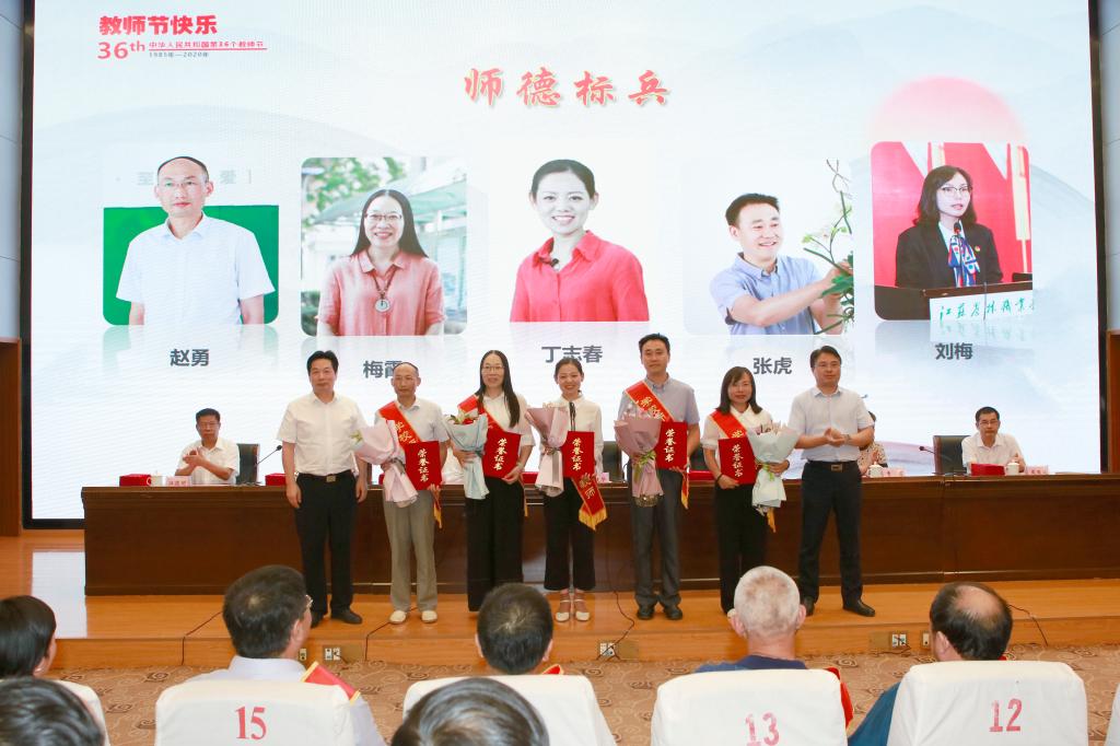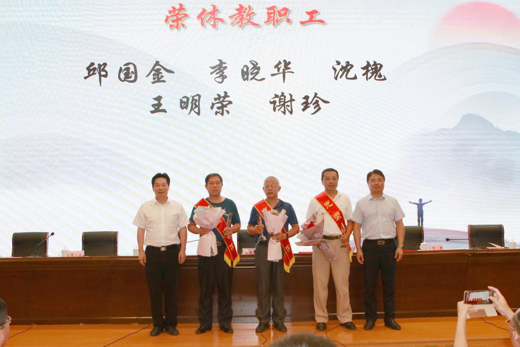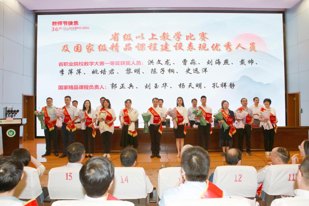师德标兵,本学年市级以上教学名师及人才工程奖项获得者,本学年省级以上教学比赛及国家精品课程建设表现优秀人员和本学年全省高校本专科优秀毕业论文及技能竞赛优秀指导老师,本学年学生工作表现优秀人员,本学年科技工作表现优秀人员。大会为受表彰的同志举行了颁奖典礼,受表彰的教师代表做了获奖交流发言。大会还为5名即将退休教师举行荣休仪式,29名新教师举行了入职宣誓仪式。