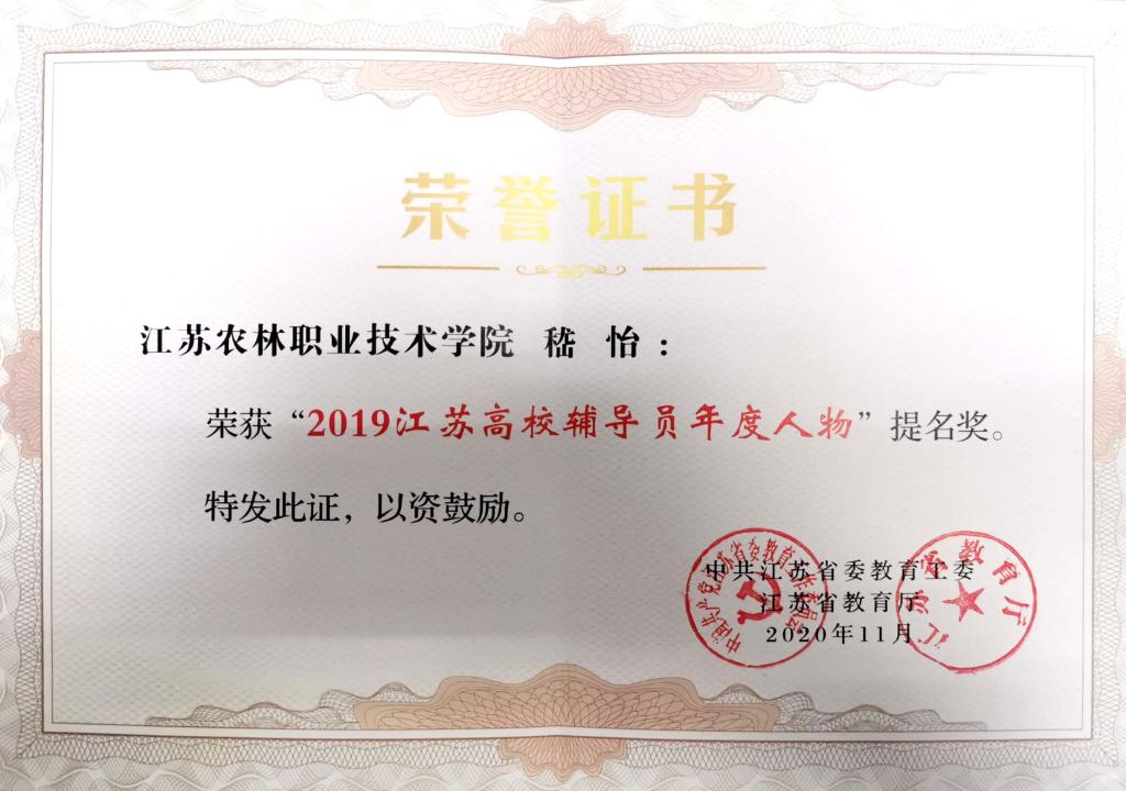 辅导员嵇怡老师荣获“2019江苏省高校辅导员年度人物”提名奖。