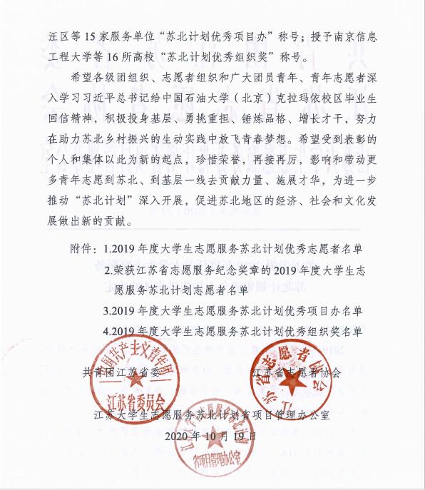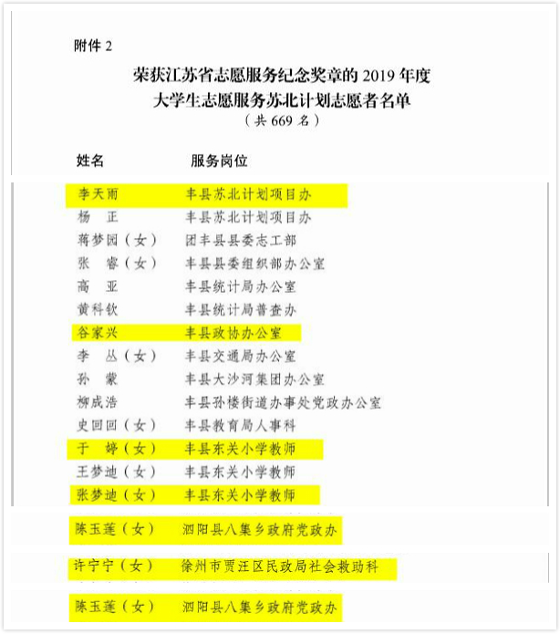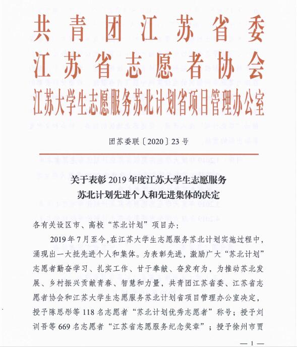 近日,共青团江苏省委、江苏省志愿者协会和江苏省苏北计划项目办发布《关于表彰2019年度江苏大学生志愿服务苏北计划先进个人和先进集体的决定》,我院毕业生张梦迪同学荣获2019年度“苏北计划优秀志愿者”荣誉称号,于婷、陈玉莲、许宁宁、杜晨晨、李天雨、张梦迪、谷家兴等7位同学荣获2019年度“江苏省志愿服务纪念奖章” 荣誉称号。