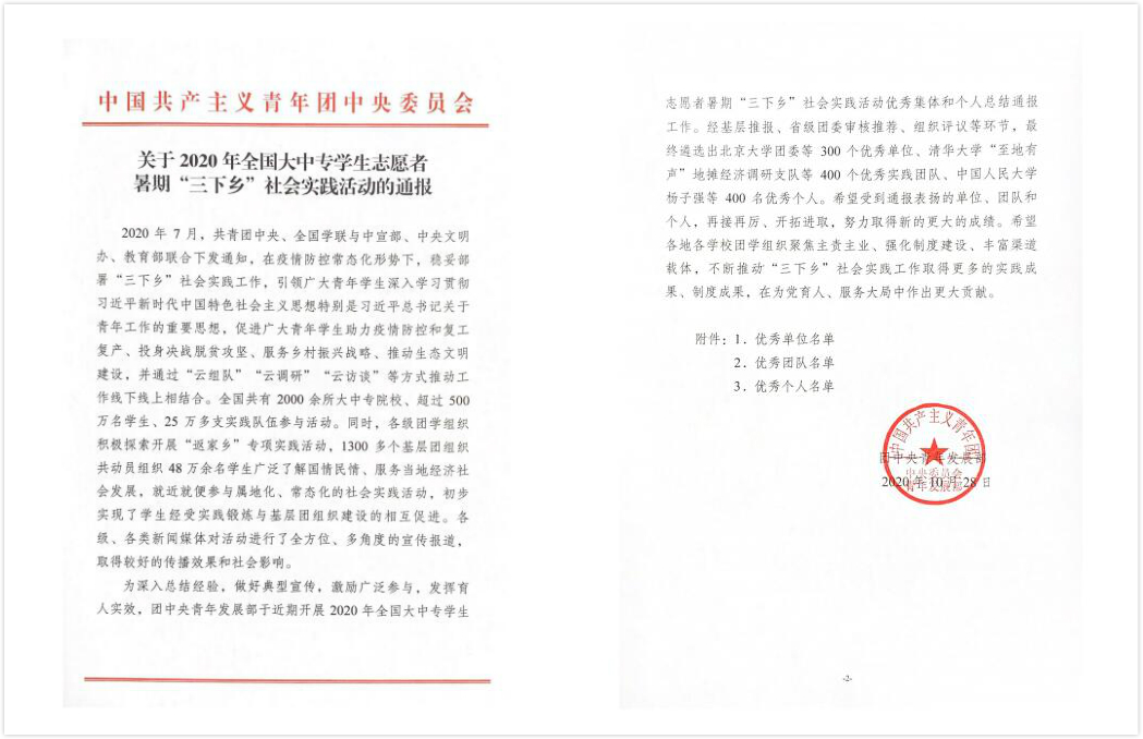 近日,团中央陆续公布了2020年暑期“三下乡”社会实践活动各项评比结果,我院成果丰硕,荣获优秀组织单位、优秀报道团队、优秀调研报告、“千校千项”最美团队、“千校千项”最美新画卷作品和优秀个人等6项表彰。