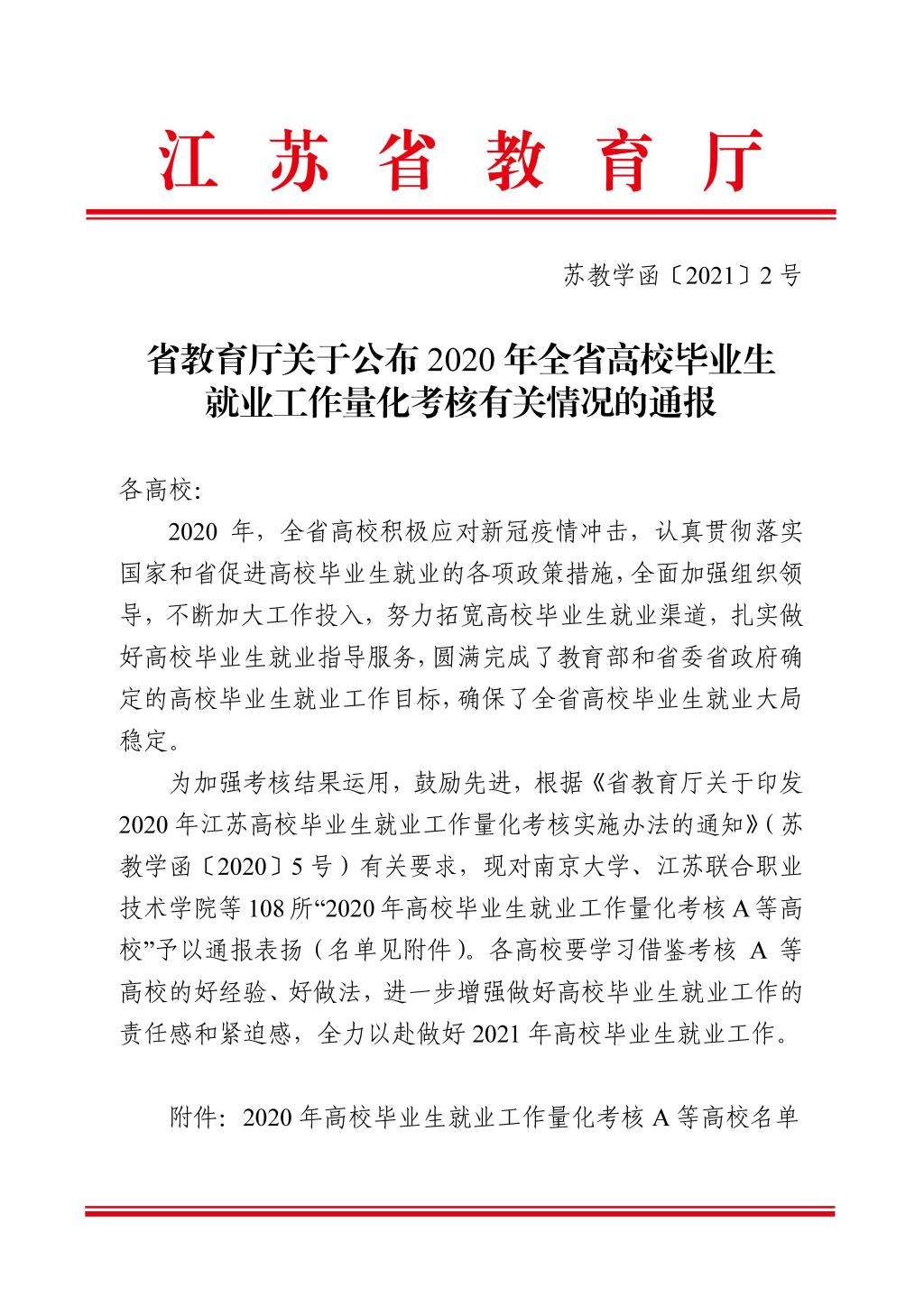 近日,省教育厅公示了《省教育厅关于公布2020年全省高校毕业生就业工作量化考核有关情况的通报》(苏教学函[2021]2号)文件,我院喜获“2020年全省高校毕业生就业工作量化考核A等高校”称号。