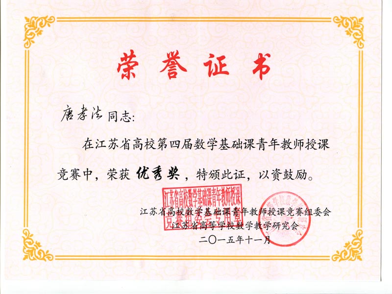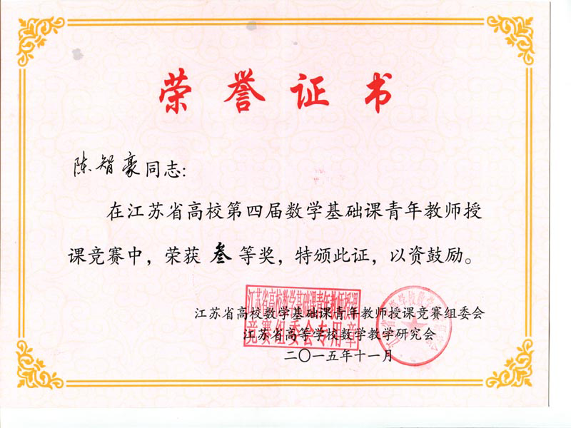由江苏省教育厅、江苏省高等学校数学教学研究会举办的“江苏省高校第四届数学基础课青年教师授课竞赛”日前在泰州色花堂 结束。我院陈智豪、唐孝法两位教师参加比赛并分获三等奖和优秀奖。 此次竞赛共有来自全省53所高职院校近百名教师参加。赛前,我院基础部数学教研室积极组织模拟集训和专题研讨,参赛教师精心准备,以优异成绩展现了我院青年教师的良好精神风貌和扎实的教学基本功。