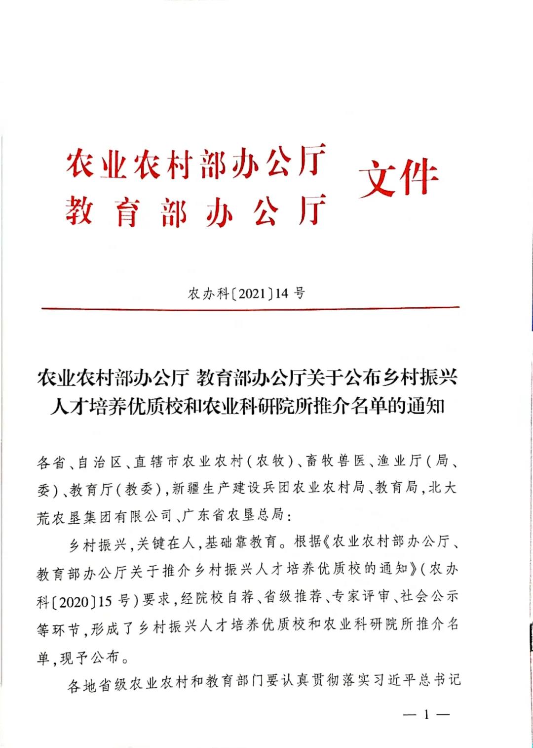 5月26日,农业农村部科技教育司、教育部职业教育与成人教育司联合正式发布乡村振兴人才培养优质校和农业科研院所推介名单,我院成功入选。