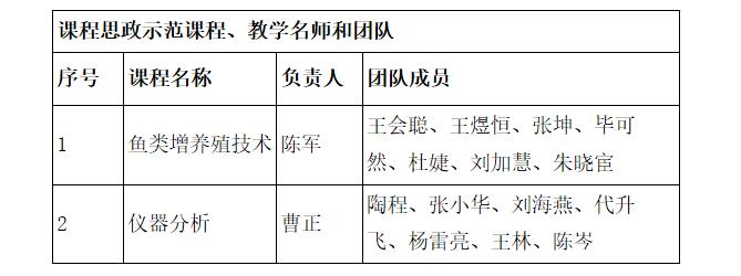日前,教育部公布了《关于公布课程思政示范项目名单的通知》(教高函〔2021〕7号),我院推荐的《鱼类增养殖技术》《仪器分析》课程获评全国首批课程思政示范课程。陈军教授和曹正研究员授课团队入选国家课程思政教学团队,陈军教授和曹正研究员获评全国课程思政教学名师。