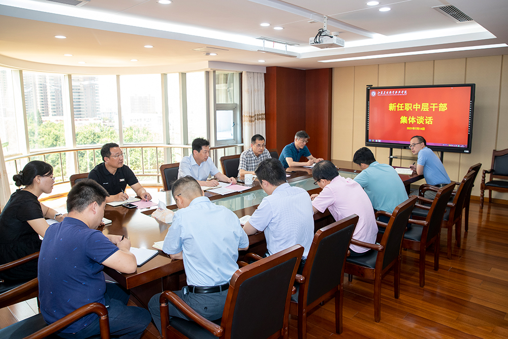 7月14日上午,我院在综合楼八楼会议室召开新任职中层副职干部集体谈话会。党委书记巫建华,党委委员、纪委书记周国义,党委委员、组织人事处处长邢军,纪委副书记、纪委办主任徐建新出席谈话会。9位新任职中层副职干部参加了谈话会。