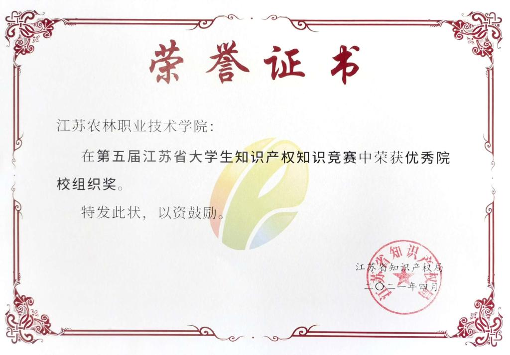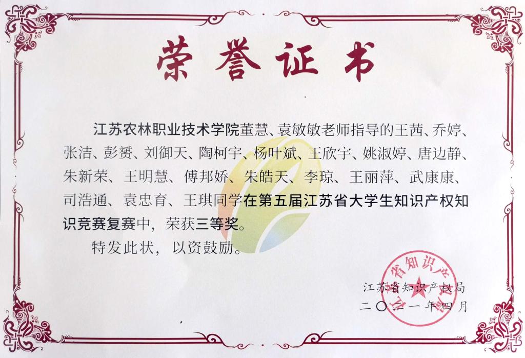 近日,由江苏省知识产权局、江苏省教育厅、共青团江苏省委主办的第五届江苏省大学生知识产权知识竞赛比赛结果揭晓,我院王茜、乔婷等20名学生组建的代表队荣获复赛三等奖,我院荣获优秀院校组织奖。