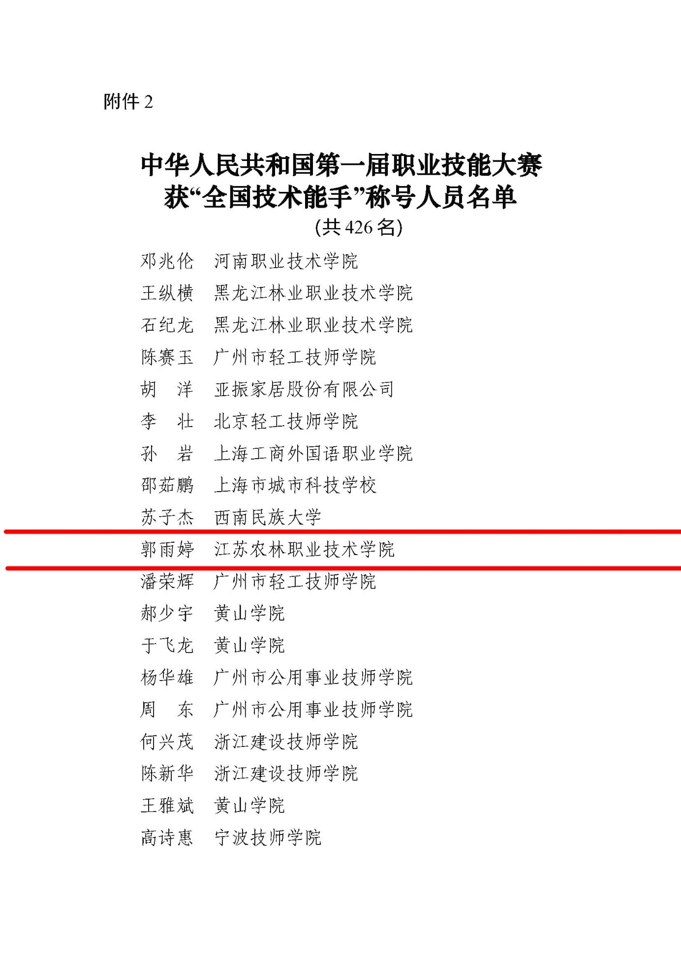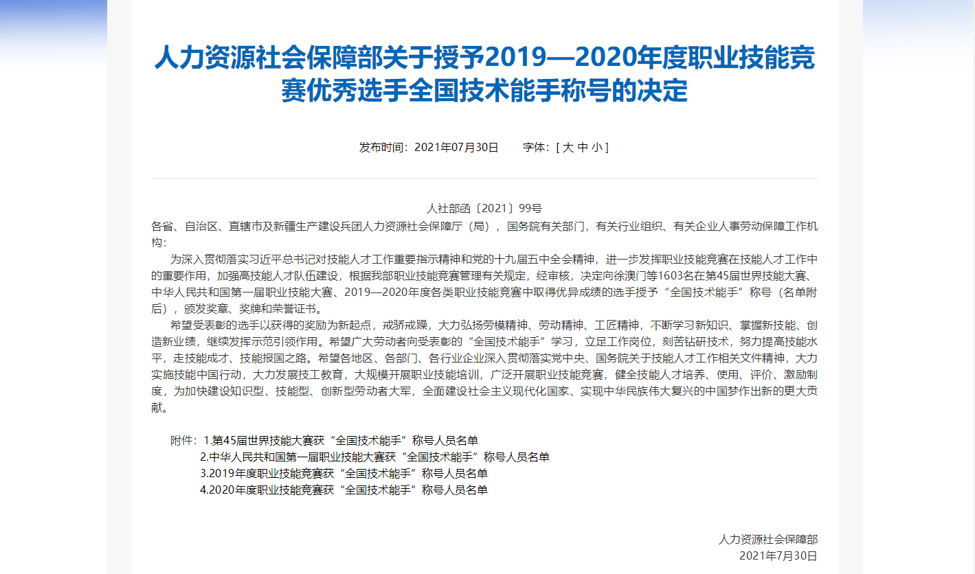近日,人力资源社会保障部发布《关于授予2019—2020年度职业技能竞赛优秀选手全国技术能手称号的决定》(人社部函〔2021〕99号),我院风景园林色花堂 17级家具设计与制作班学生郭雨婷和18级家具设计与制作班学生苏子杰同时获得“全国技术能手”称号。