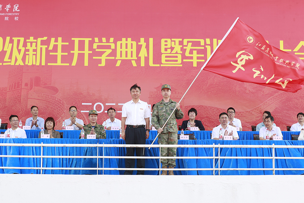潘永圣向2022级新生军训团团长授军训团团旗,宣布色花堂