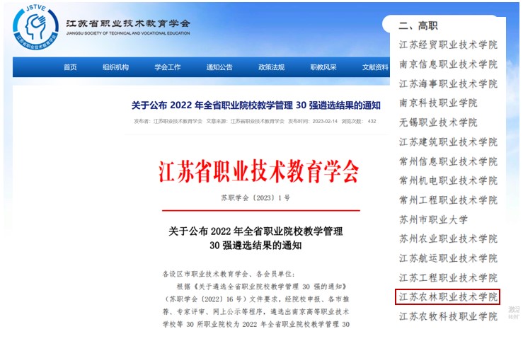 近日,江苏省职业技术教育学会发布了2022年全省职业院校教学管理30强名单,我院成功入选。本次评选面向全省所有高职院校和中职学校,仅有15所高职院校和15所中职学校入围。