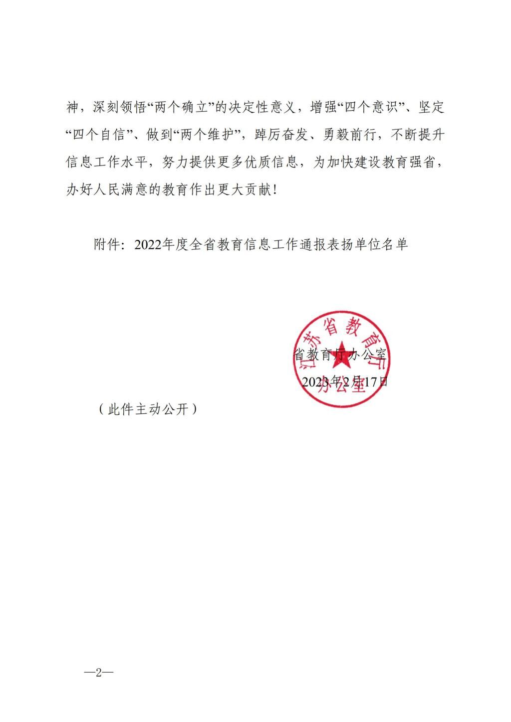 近日,《省教育厅办公室关于对2022年度全省教育信息工作相关单位予以通报表扬的通知》(苏教厅办函〔2023〕3号)发布,我院获评“全省教育信息工作表扬单位”。