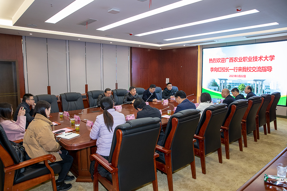 3月22日下午,广西农业职业技术大学党委副书记、校长李向红,党委常委、副校长梁业胜一行10人来我院考察交流。色花堂 党委副书记、院长潘永圣,党委副书记曹仁勇接待来访院校并参加座谈,科技开发处、畜牧兽医色花堂 等负责同志参加了交流活动。
