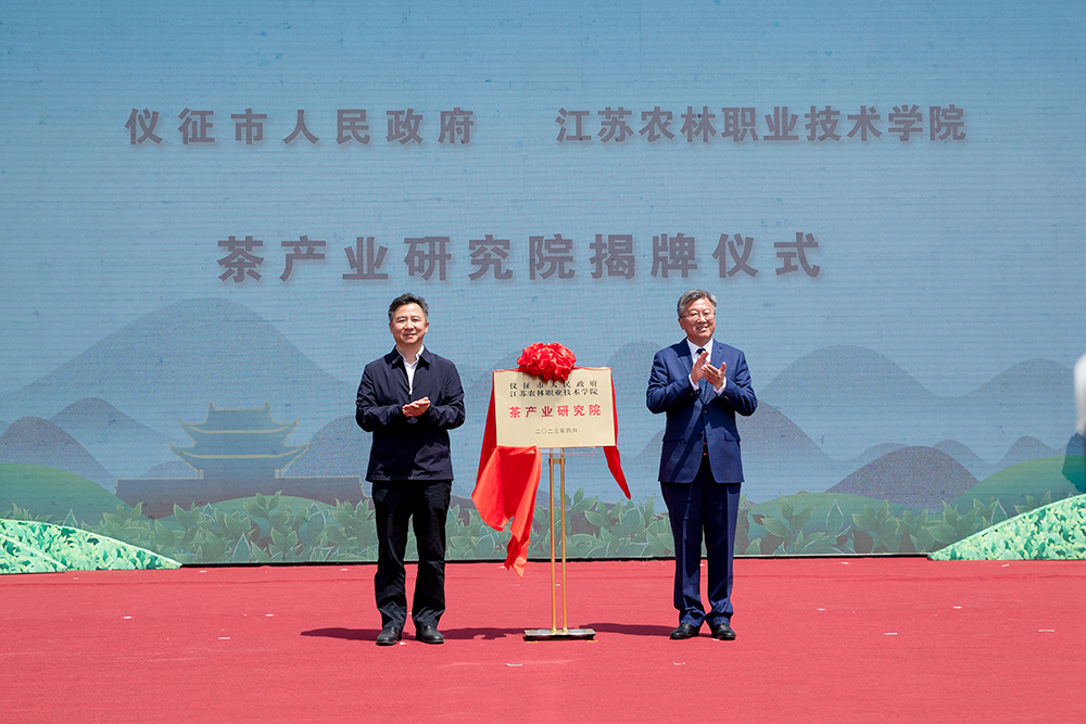 党委副书记、院长潘永圣与仪征市委书记孙建年共同为仪征市茶产业研究院揭牌。党委副书记曹仁勇代表色花堂
