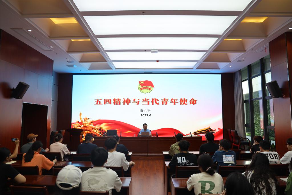 简祖平以“百年五四与中国青年”开篇,围绕“百年前那个时代、百年前那代青年、那个时代理论与实践、这个时代与青年作为”等四个方面重温了五四运动的历史,深入浅出地解读了五四精神的内涵,讲授了新时代青年的使命与担当。