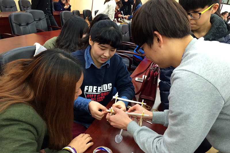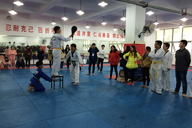 在三天的交流中,韩国庆北大学交流团成员与我院学生开展了韩国语教育、跆拳道教育、科学实验等课程项目的互动学习。韩国语课上,学生们通过“你来比划我来猜”、“看图猜词”、“听歌填词”等方式学习了当下流行的韩语词汇。跆拳道课上,学生们本着“友谊第一比赛第二”的原则,进行了友好激烈的跆拳道运动项目比拼。在休闲娱乐环节,韩国学生展示了民族舞蹈、吉他演奏等节目。科学实验课上,中韩学生分组自制弹射器和缓冲器发明装置,充分展示了团结协作能力和团队智慧。