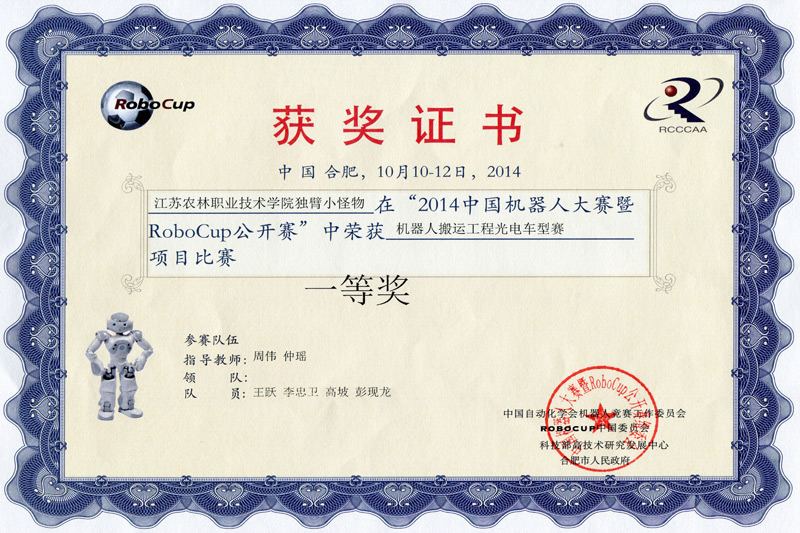 近日,2014中国机器人大赛暨RoBoCup公开赛总决赛在合肥博展中心举行,在与众多本科名校的激烈争夺中,我院由信息工程系周伟、仲瑶老师指导的光电搬运机器人项目团队,获得光电搬运组总决赛一等奖的好成绩。