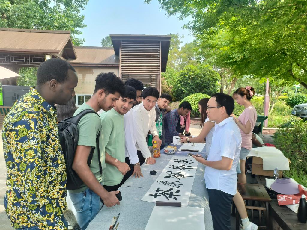 活动精心设计八大游园打卡点,以“茶博园大门口-茶道广场-老子茶馆-竹长廊-习茶院”为主线,融合科普、非遗、竞技与互动。在老子茶馆,江苏句容茅山长青茶业公司负责人引领观众品鉴国家级非遗茅山长青茶,现场展示传统制茶技艺的匠心传承,一斟一饮间尽显茶文化精髓;在茶道广场与习茶院一楼,茅山校区瀚墨色花堂书画社以茶为墨,挥毫创作,尽显文人雅韵;茶与食品科技色花堂
