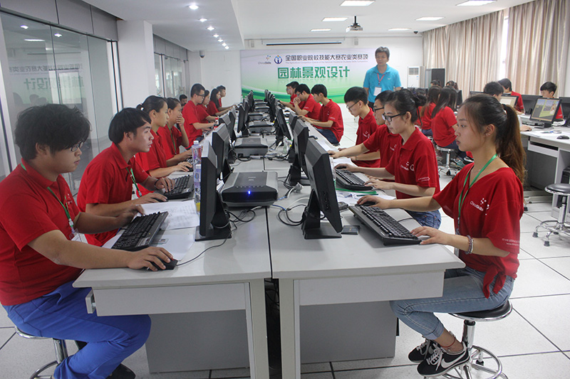 来自全国各地职业院校的122名参赛选手分为61个小组参赛。参赛选手在3.5小时内,应用CAD、PS、3Dmax、SketchUp等软件对给定绿地进行景观设计,合作完成了总平面图、局部效果图、设计说明等。