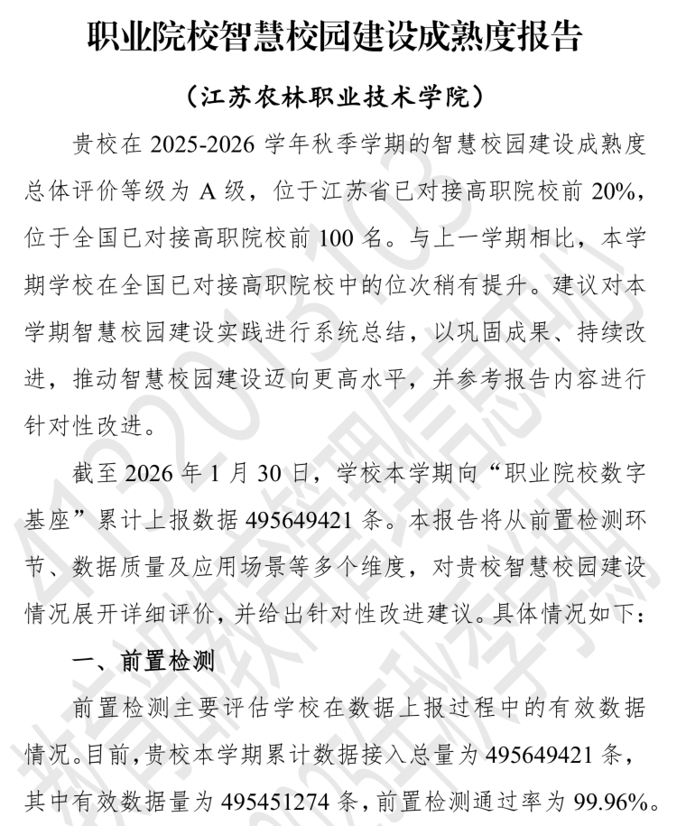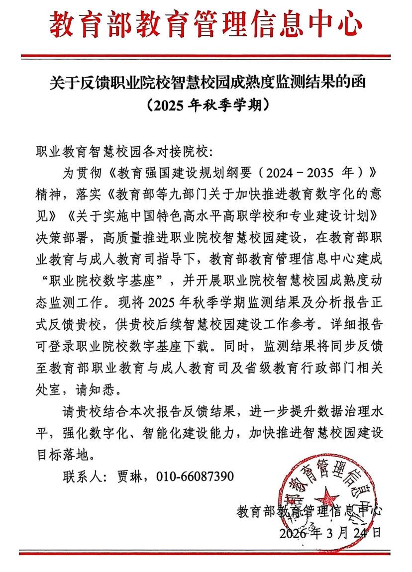 3月24日,教育部教育管理信息中心发布了《职业院校智慧校园建设成熟度报告》,对2025学年秋季学期全国职业院校智慧校园建设成熟度进行了监测分析与评价,我校在获评最高等级A级。
