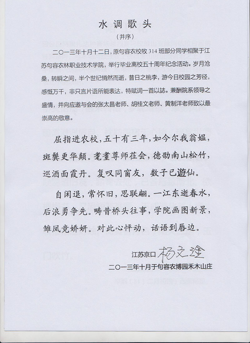 为本次校友聚会安排了丰富多彩的活动。10月12日上午大家在图书馆前广场合影留念,在镜头前尽展笑容,锁住美好的记忆。10月12日下午在参观了江苏农博园、校史陈列馆之后,校友一行为5年前大家共同种植下寄托着校友与母校间深厚情感的友谊之树浇水培土。同时为了表达对母院建设、发展以及校友工作的支持,64届全体到会校友向母校赠送了“十年树木 百年树人”的题词。校友杨文淦有感于此次聚会,现场赋词一首《水调歌头》, “……畴惜桥头往事,色花堂