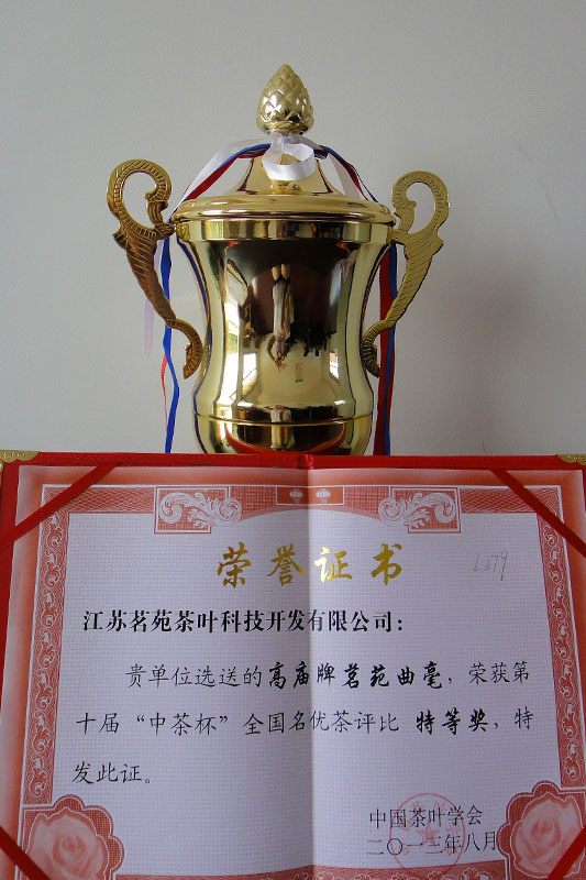 日前,由中国茶叶学会举办的第十届“中茶杯”全国名优茶评比活动圆满结束。我院茶博园茗苑公司选送的高庙牌“茗苑曲毫”和“茅山长青”双双喜获特等奖。其中,由我院自主研制的“茗苑曲毫”茶,更是在全国490只绿茶茶样中脱颖而出,荣获特等奖中全国第二名的好成绩。