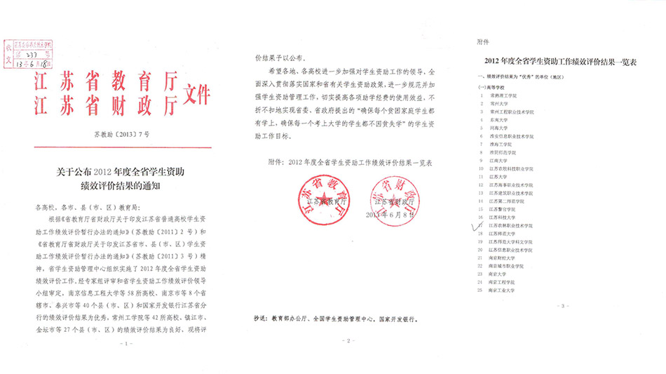 根据《省教育厅省财政厅关于印发江苏省普通高校学生资助工作绩效评价暂行办法的通知》(苏教助〔2011〕2 号)和《省教育厅省财政厅关于印发江苏省市、县(市、区)学生资助工作绩效评价暂行办法的通知》(苏教助〔2011〕3 号)文件精神,经省学生资助管理中心专家组评审和省学生资助工作绩效评价领导小组审定,我院学生资助工作再次喜获“优秀”等次。