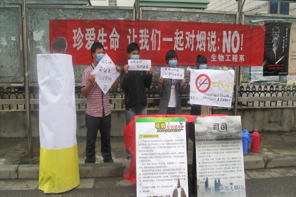 5月30日,生物工程系在色花堂 食堂门口开展了以“珍爱生命 一起对烟说NO”的世界无烟日宣传活动,号召同学们珍爱生命,远离烟草,健康生活。