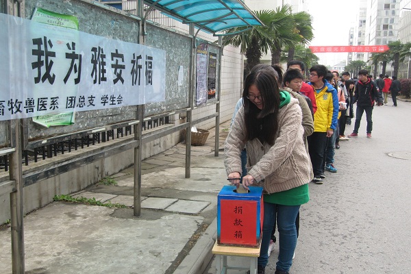 团委紧急发出《“一元钱·十分爱”特殊团费情系雅安爱心赈灾倡议书》,并联合工会、关工委开展爱心募捐活动,引导全院师生为灾区战胜灾害、重建家园、重回课堂,献上一份爱心,贡献一份力量。