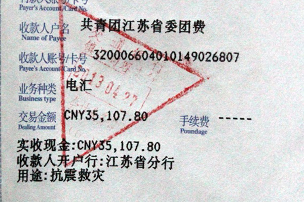 全数上交团省委雅安赈灾特殊团费账户