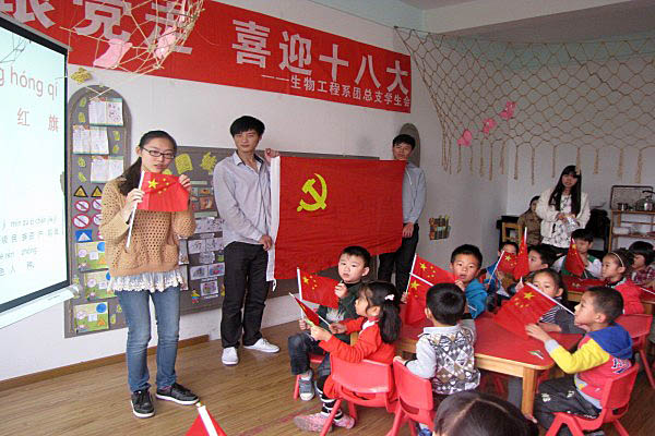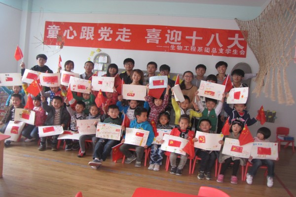 为了迎接党的十八大的胜利召开,10月24日下午,我院生物工程系志愿者们走进领秀星城幼儿园开展了“童心跟党走 喜迎十八大”主题教育活动。活动中,志愿者们给每个小朋友们分发国旗,教他们学唱国歌,通过图片、卡通等通俗易懂的形式讲解国旗、党旗的基本知识,让孩子们学到了很多有关党的知识,从小培养孩子们爱国、爱党的意识。在他们的指导下,孩子们还用手中的画笔描绘出自己心目中的美丽祖国。