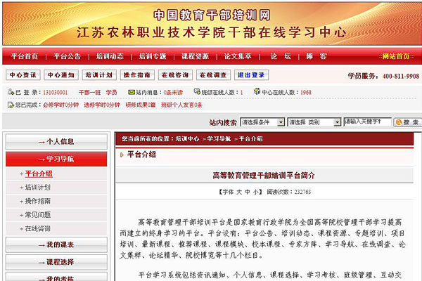 中国教育干部培训网“高校管理者培训平台”,与中国教育干部培训网对接,由该网核心主站实时向学习中心发布最新权威课程资源。中国教育干部培训网按照适应高等教育改革与创新的需要、建设高素质干部队伍的要求设立培训课程。培训课程体系紧密联系高等教育实际,针对高等教育的规律、特点和热点、难点,采集优质课程资源,构建一个门类较为齐全、内容较为丰富的教育干部远程培训课程资源库。主要设有党的建设、时事政治、政策法规、改革发展、学校法制、学校管理、职业教育等专题栏目。