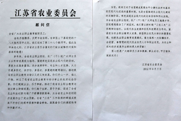 金秋丹桂飘香,沃野丰收在即。在第二十八个教师节来临之际,江苏省农业委员会发来慰问信,向我院教职员工致以诚挚的问候和崇高的敬意。