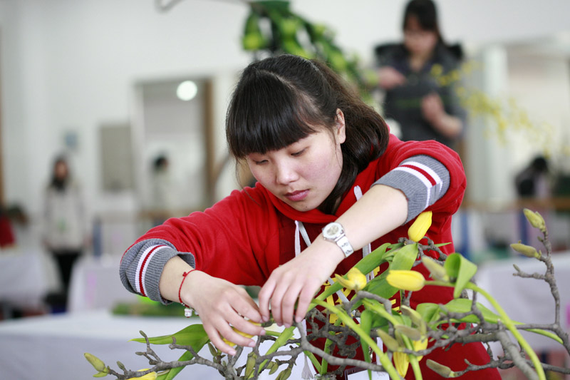 艺术插花选手在比赛中