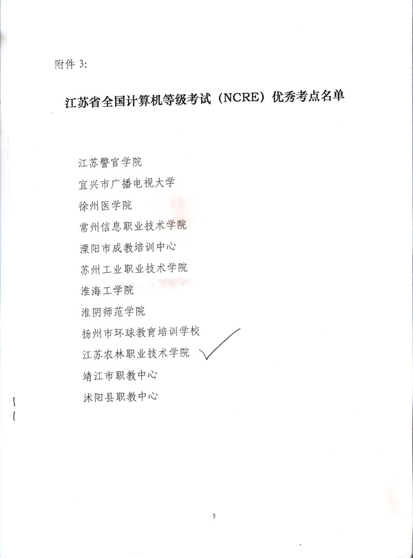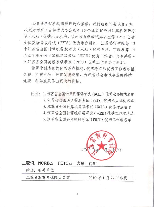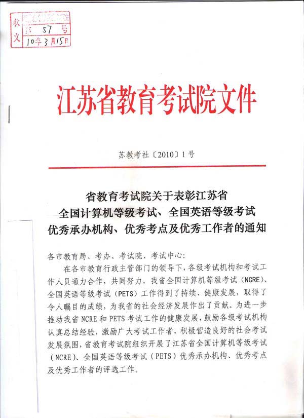 经计算机等级考试主管机构慎重评选和推荐,江苏省教育考试院组织评委认真研究,我院全国计算机等级考试考点荣获“江苏省全国计算机等级考试(NCRE)优秀考点”称号。