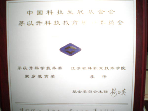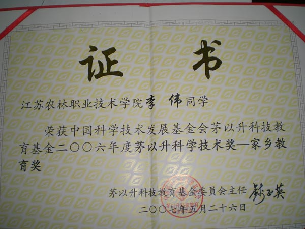 我院学生会主席、机电工程系05机电一体化技术班李伟同学荣获中国科学技术发展基金会茅以升科技教育基金二〇○六年度茅以升科学技术奖——家乡教育奖。
