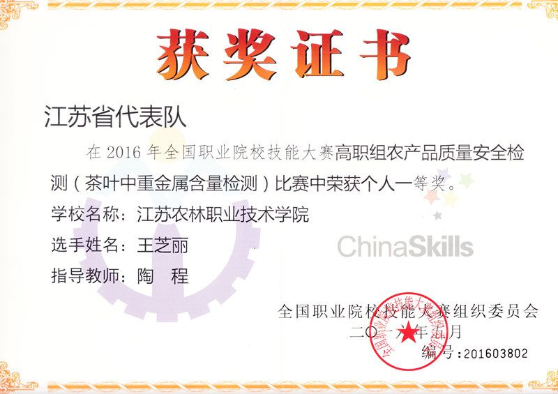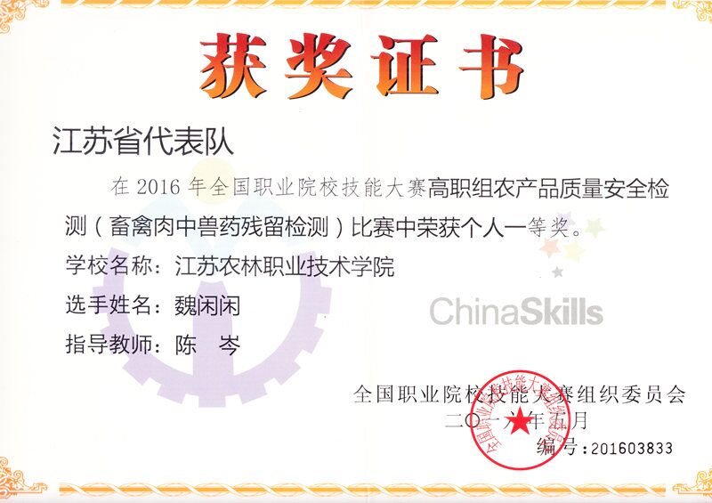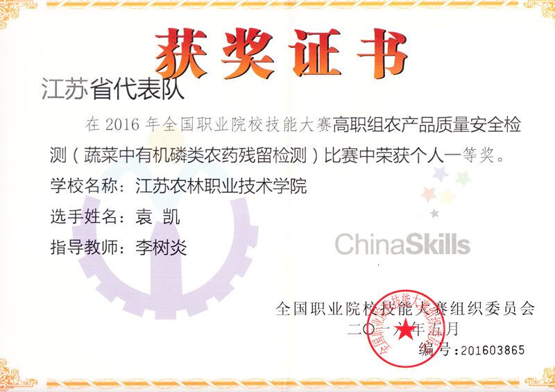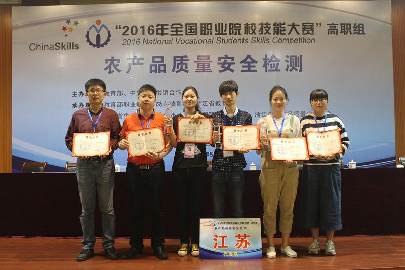 隆重举行。我院生物工程系3名学生代表江苏省参赛,经过激烈角逐,袁凯同学荣获“蔬菜中有机磷类农药残留的检测”一等奖;魏闲闲同学荣获“畜禽肉中氟喹诺酮类兽药残留的检测”一等奖;王芝丽同学荣获“茶叶中重金属含量的检测”一等奖;李树炎、陈岑、陶程3位老师获“优秀指导老师”称号,我院成为唯一囊括三项赛事金奖的高职院校。