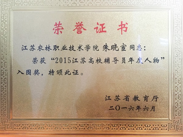 6月16日,“2015江苏省大学生年度人物暨高校辅导员年度人物”颁奖典礼在南京大学举行。我院畜牧兽医系2013级宠物养护与疫病防治专业陆娟同学、辅导员朱晓宦老师荣获“2015江苏省高校辅导员年度人物暨大学生年度人物”入围奖。