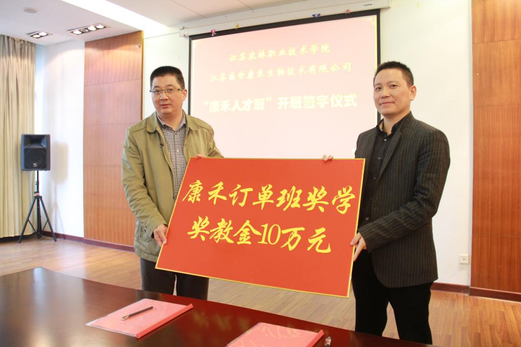 随后,双方进行了“康禾人才班”学徒制订单班签字仪式,并颁发了“康禾奖学奖教基金”,康禾奖学奖教基金旨在奖励“康禾班”表现突出的同学和老师,协议签订后,“康禾班”学生将定期赴该公司参加顶岗实习。