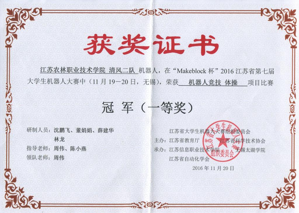 我院信息工程系周伟、崔明等教师带领的6支队伍获得了5个奖项的好成绩。机器人竞技体操项目的两个参赛队分别获得一等奖(冠军)和二等奖;光电搬运机器人技术挑战赛的参赛队获一等奖;机器人竞技交叉足赛项的两个参赛队分别获得二、三等奖。