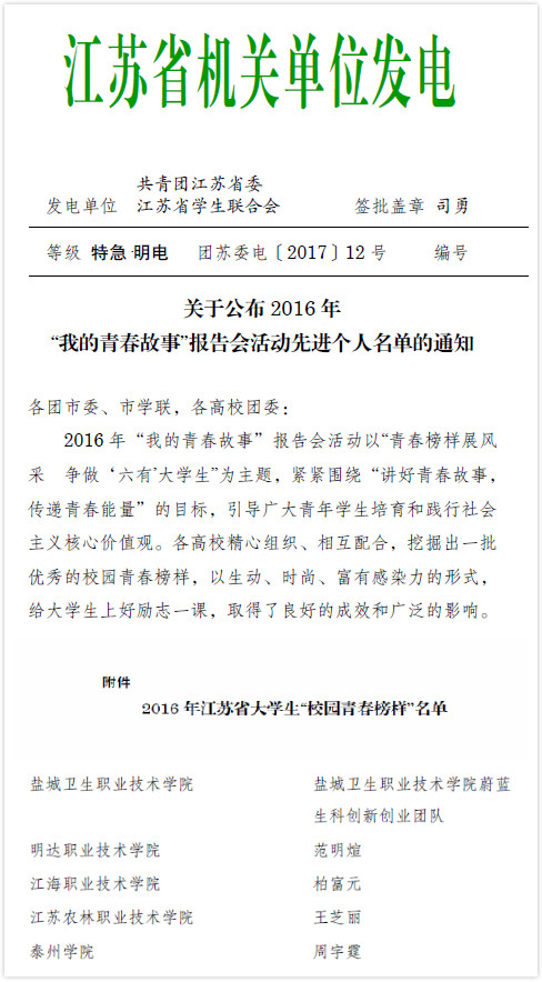 近日,共青团江苏省委、江苏省学生联合会联合发文,对2016年“我的青春故事”江苏省大学生成长故事会中表现突出的个人进行了表彰。我院食品加工技术专业王芝丽同学被授予2016年江苏省大学生“校园青春榜样”荣誉称号。