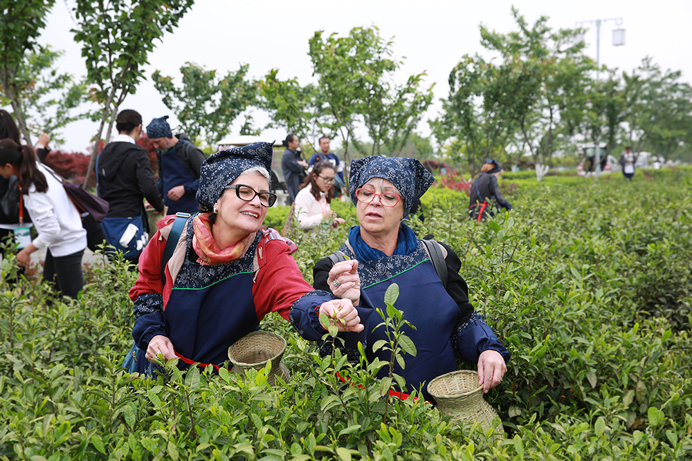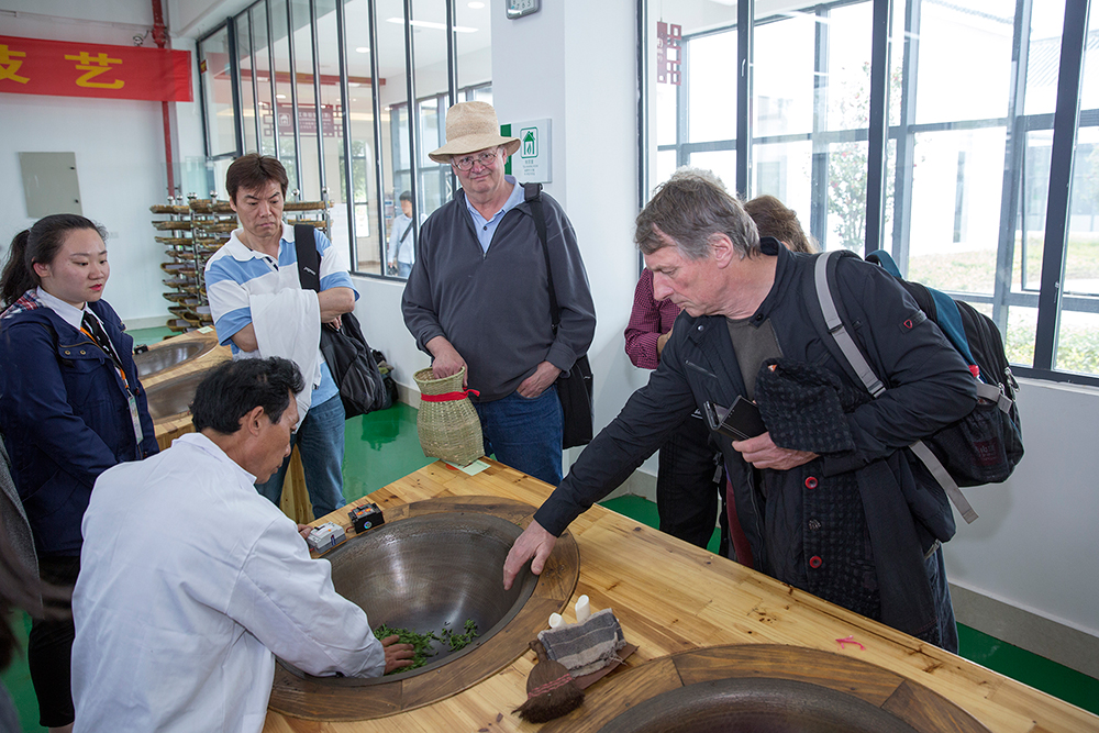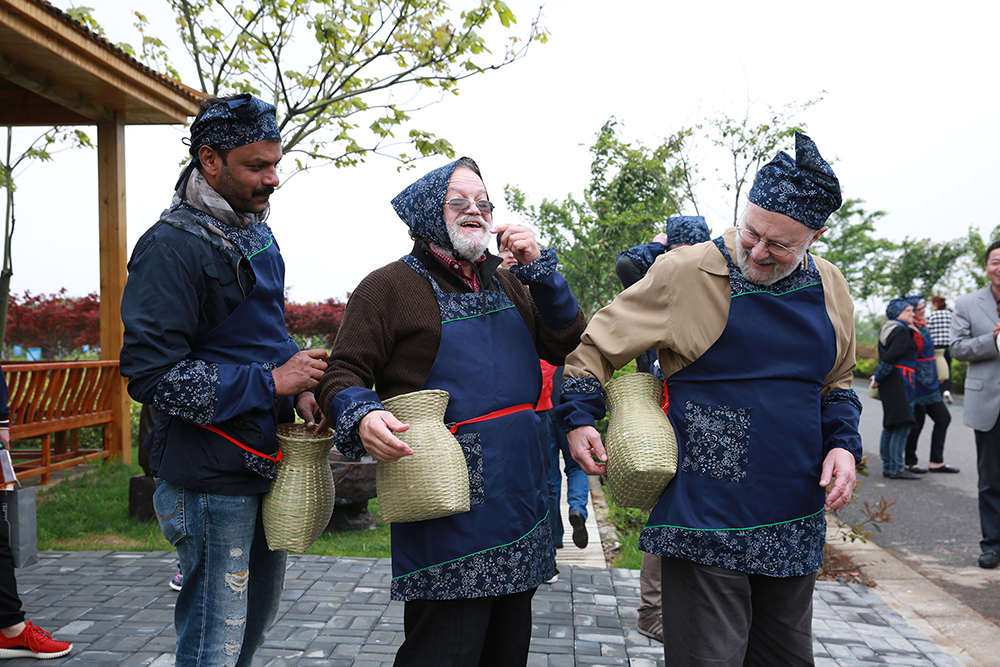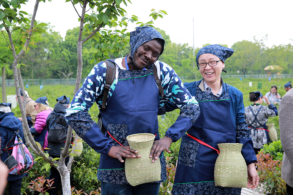 王润贤教授向国际陶艺家们介绍了中国茶产业、历史、制作工艺和茶文化。茶艺专业学生表演了紫砂茶艺和绿茶茶艺。国际友人们在领略了中国神奇的茶文化后,还兴致勃勃地背起茶篓,在我院师生指导下亲自体验手工采茶和制茶乐趣。