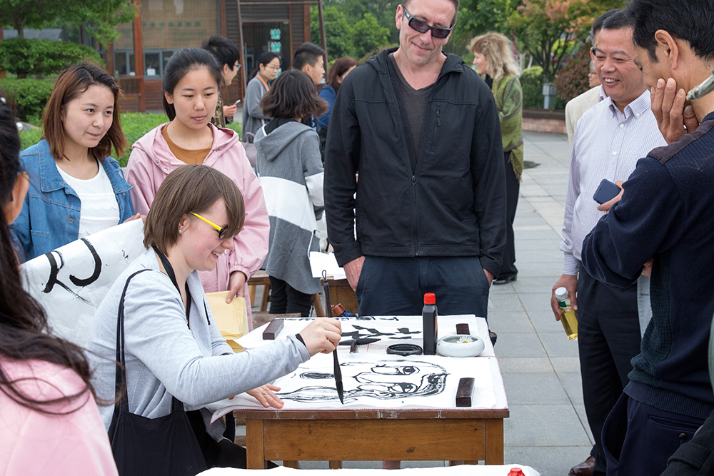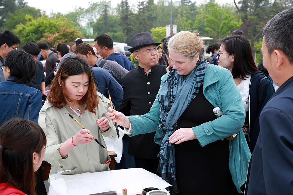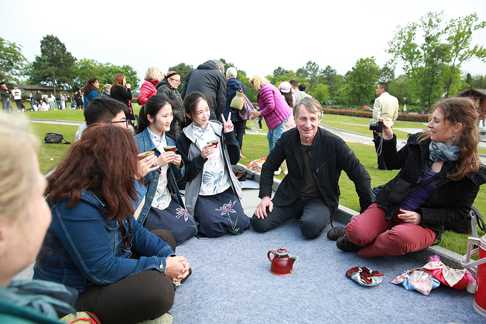 活动期间,我院师生还进行了书法、茶艺、旗袍、武术等中国文化展示,并与陶艺家们举行了以“品中国绿茶”为主题的大型露天茶会,大家在茶博园的草坪广场上铺上茶席,席地而坐,品茶论道,分享中国博大精深的茶文化。