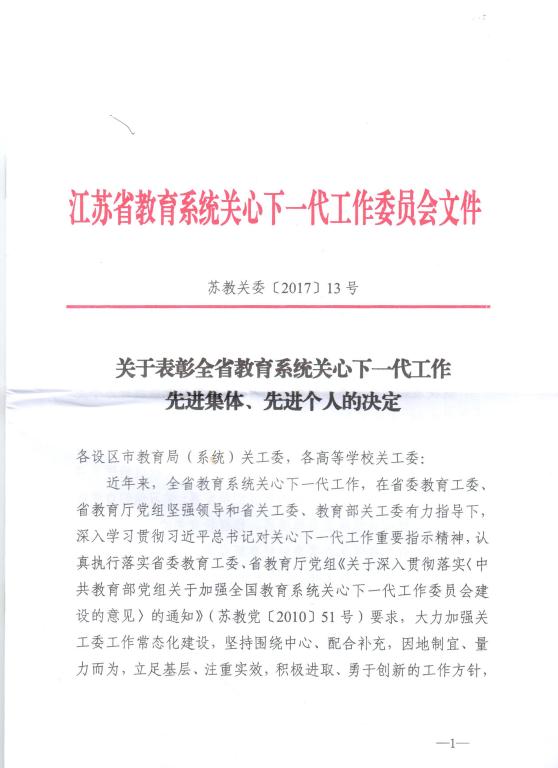 日前,我校关工委被省级教育系统关工委评为先进集体,校关工委副主任江德明同志被评为先进工作者,并获表彰。