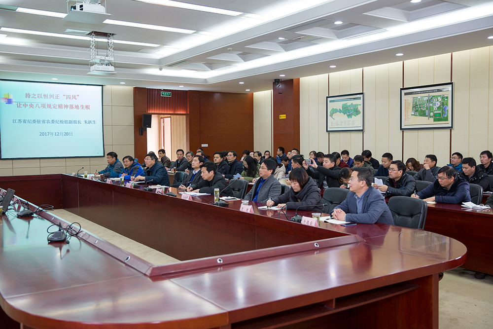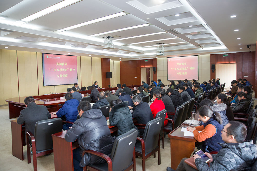 为深入贯彻落实党的十九大对作风建设作出的新部署,增强学校领导干部贯彻落实的自觉性,提高政治敏锐性,12月20日,我校邀请省纪委驻省农委纪检组副组长朱跃生同志来校作贯彻落实中央八项规定精神专题讲座,学校领导班子、中层干部、纪检监察和财务工作人员参加了此次讲座。