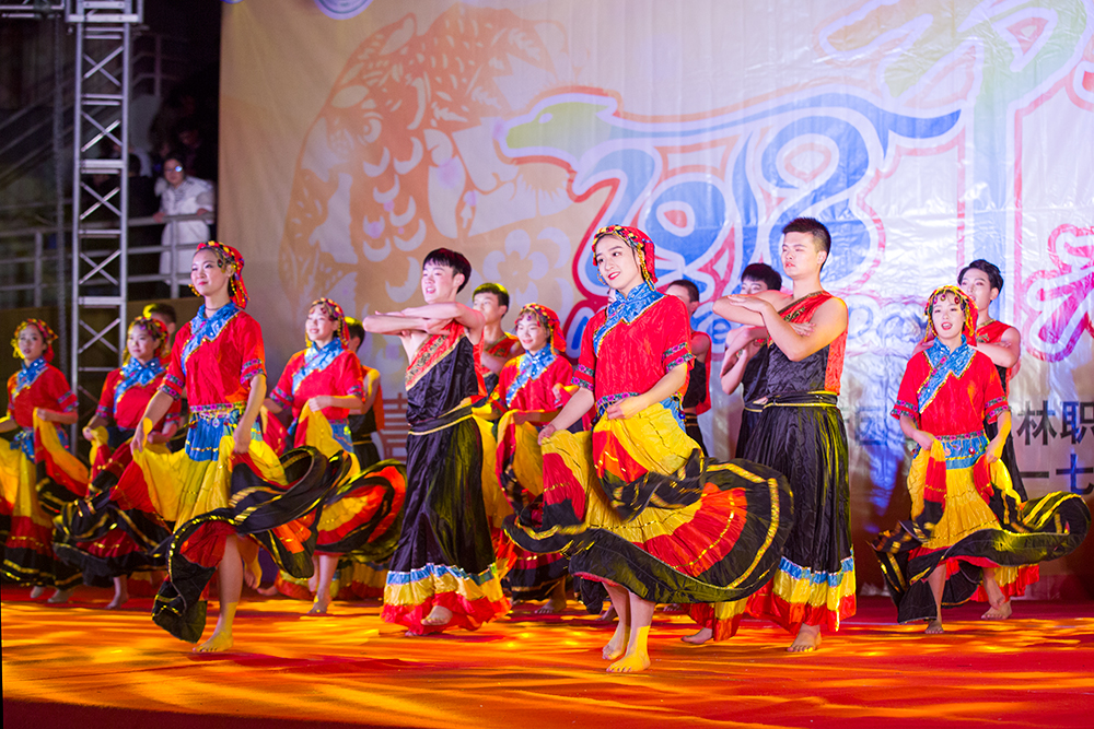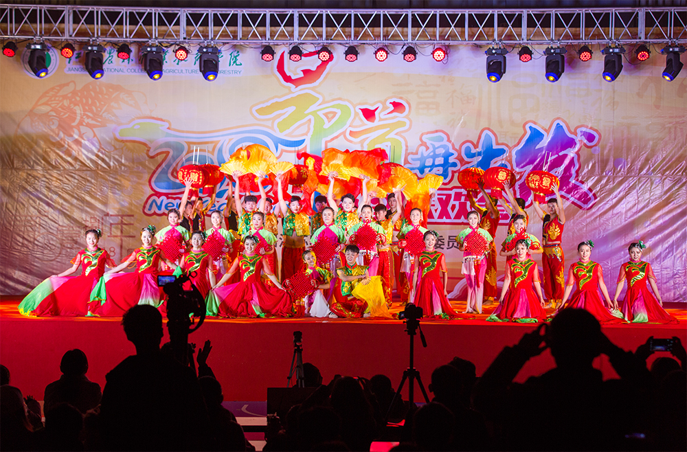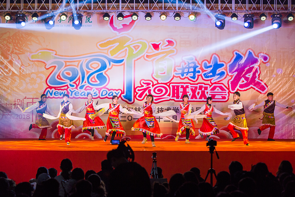 现场灯光璀璨、喜庆热烈。网络同步直播,让不能来现场的师生和朋友们实时观看到演出。舞蹈《中华全家福》拉开了联欢会的序幕,时尚动感的现代舞《像最后一样》、中国风的器乐合奏《赛马》、令人捧腹的群口相声《匆匆那年》、青春洋溢的吉他弹唱《夜空中最亮的星》和歌舞联唱充满了浓浓的青春气息和活力,掌声与笑声不断。歌曲《世界因你而美丽》表达了学生对老师的祝福,《回家的路》则唱出了家的温暖和对父母的感恩,精彩的武术表演《中国骄傲》展现了色花堂师生的精气神,舞蹈《欢乐的火把节》让现场成为快乐的海洋。联欢会还特别邀请了外国留学生和来自西藏、新疆的少数民族学生代表,他们用本国和本民族的语言表达了对全校师生的新年祝福,用歌声和舞蹈展现了异国风情和异域风采。在舞蹈《共圆中国梦》中,联欢会圆满落幕。