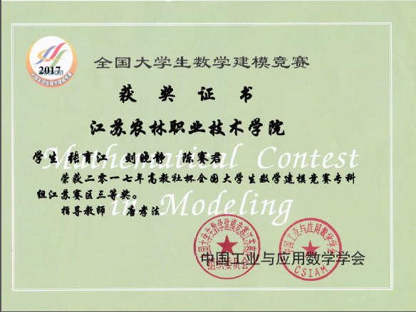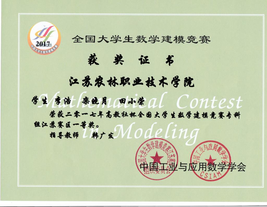 日前,2017年全国大学生数学建模竞赛结果揭晓,我校学子荣获江苏赛区专科组一等奖1项、三等奖1项。
